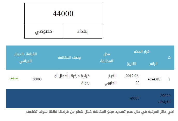 وغرمت المرور عجلة العاكوب بـ {30} ألف دينار وهي غرامة مضاعفة عن "قيادة المركبة بإهمال او رعونة" ارتكبها بتاريخ 2 شباط 2019، وكان محل المخالفة في "الكرخ الجنوبي" دون ذكر المنطقة تحديداً.