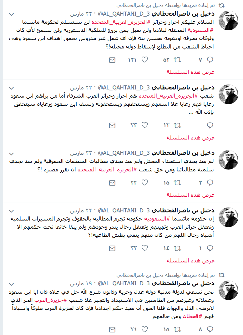 ووصف المعارض القحطاني "شعب الجزيرة العربية المتحدة"، وفق تعبيره، بأنهم "أحرار وحرائر العرب الشرفاء"، مستدركًا: "أما من يراهم ابن سعود رعايا فهم رعايا علا اسمهم ويستحقهم ويستحقونه ونسف ابن سعود ورعاياه سيتحقق بإذن الله".