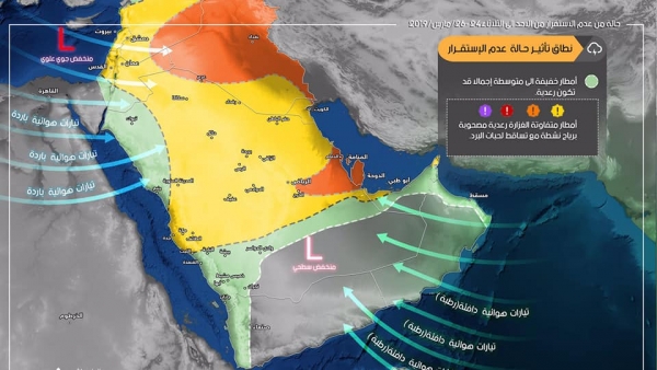 وقال المتنبئ الجوي، صادق عطية، في منشور له على الفيسبوك "هبوط حاد للضغط السطحي اليوم وغداً الاثنين مما يعمق حالة عدم الاستقرار حيث تتجه الرياح الرطبة من بحر العرب مرورا بالخليج الفارسي وتتلاقى مع رياح باردة من الشمال في مركز المنخفض".