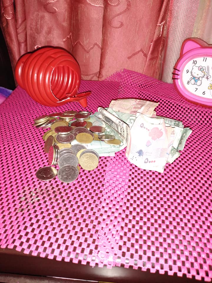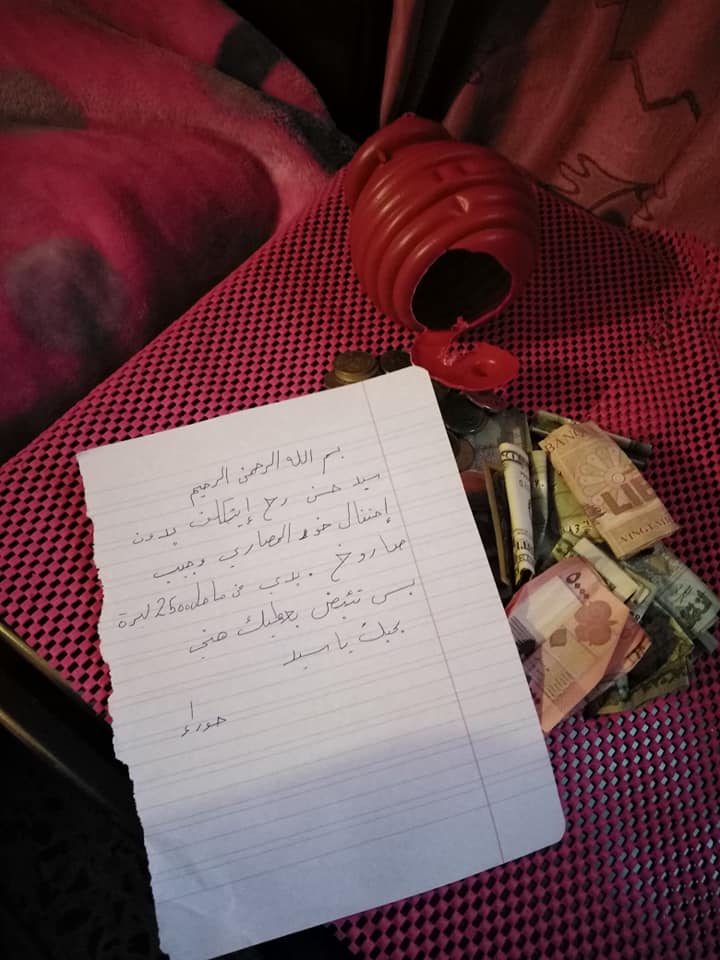 وقد ارفق المنشور بصورة لـ"القجة" وبجانبها نقوداً ورسالة كتبتها حوراء لهذه الغاية الى الامين العام لحزب الله السيد حسن نصر الله، تقول فيها: "سيد حسن رح اتكلف بدون احتفال، خود المصاري وجيب صاروخ."