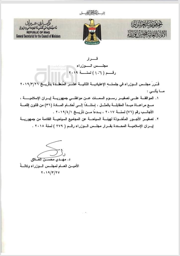 بالوثيقة .. قرار مجلس الوزراء العراقي حول الغاء رسوم الـتأشيرة عن الإيرانيين