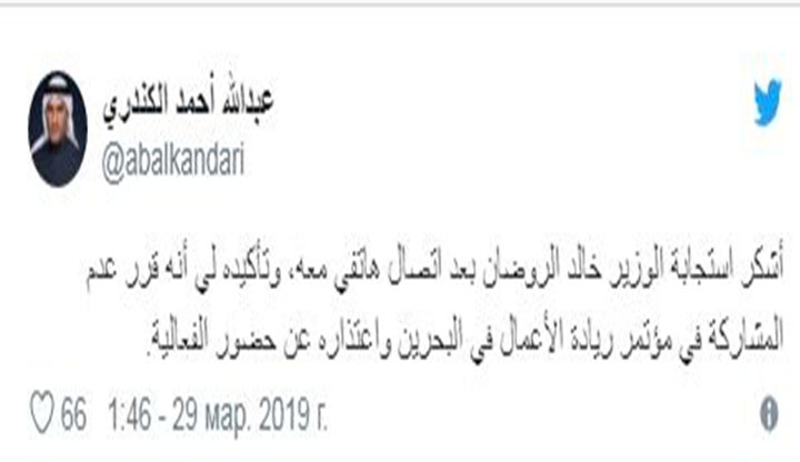 وقال في نص تغريدة نشرها على "تويتر" يوم الجمعة: "أشكر استجابة الوزير خالد الروضان بعد اتصال هاتفي معه، وتأكيده لي أنه قرر عدم المشاركة في مؤتمر ريادة الأعمال في البحرين واعتذاره عن حضور الفعالية".
