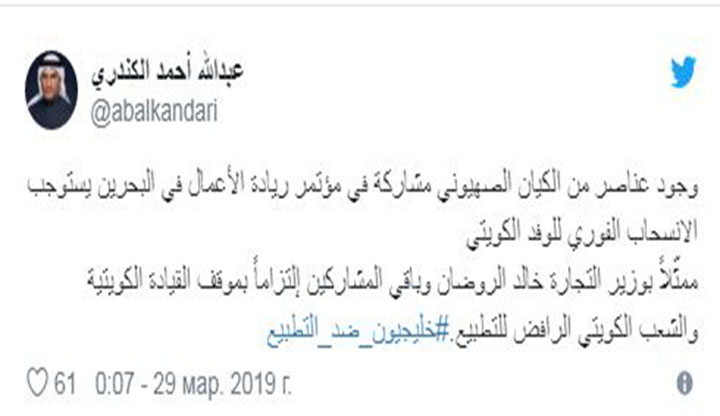 وأشار إلى أن مشاركة وفد من "إسرائيل" في مؤتمر ريادة الأعمال في البحرين تستوجب الانسحاب الفوري للوفد الكويتي ممثلا بوزير التجارة خالد الروضان وباقي المشاركين.