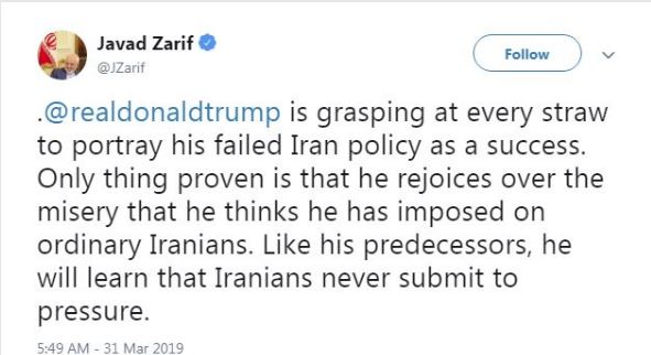 وقال ظريف في تغريدة على حسابه الشخصي في موقع تويتر: ان ترامب يلجأ الى أي ذريعة تافهة لإنجاح سياسته الفاشلة ضد ايران.