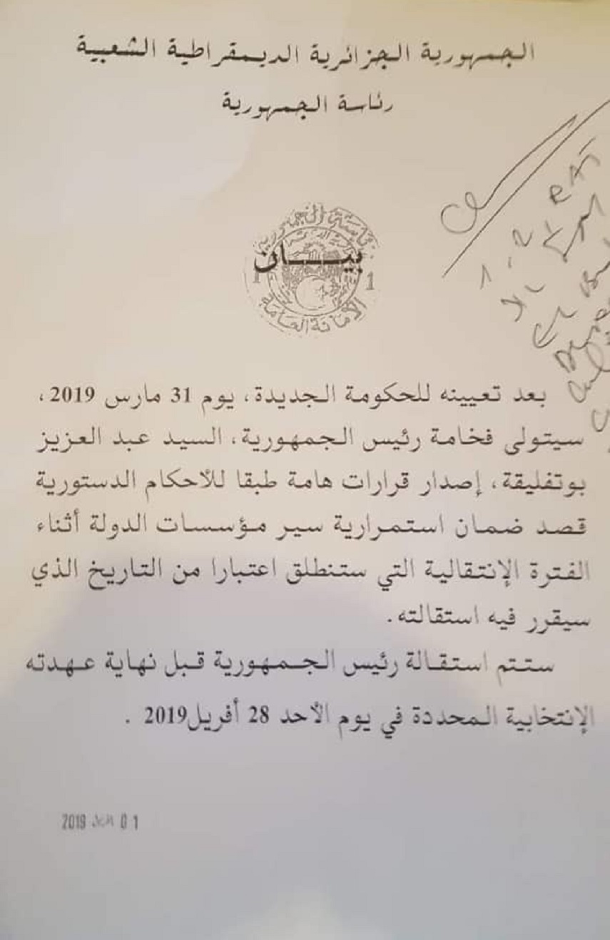 وأفادت الرئاسة الجزائرية في بيان بأنه وبعد تعيينه للحكومة الجديدة يوم 31 مارس 2019، سيصدر الرئيس بوتفليقة قرارات هامة طبقا لأحكام الدستور.