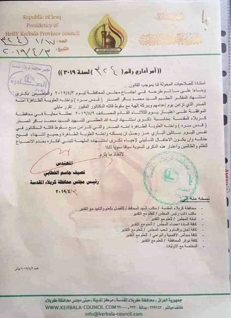 نشرت السومرية نيوز، امس الخميس، وثيقة صادرة من مجلس محافظة كربلاء تتضمن تعطيل الدوام الرسمي في المحافظة يوم الثلاثاء المقبل المصادف 9/ 4/ 2019 بمناسبة ذكرى استشهاد السيد محمد صادق الصدر.