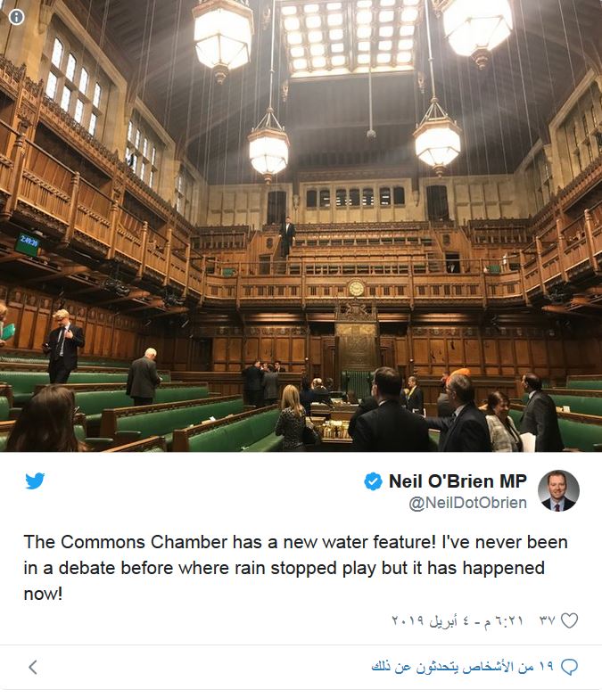 قطعت جلسة مجلس العموم البريطاني، يوم أمس الخميس، بسبب تسرب مياه لأمطار من سقف البرلمان إلى القاعة في الوقت الذي بدأ فيه أعضاء البرلمان بنشر صور قاموا على موقع التواصل الاجتماعي "تويتر" لسقوط المياه في المجلس.
