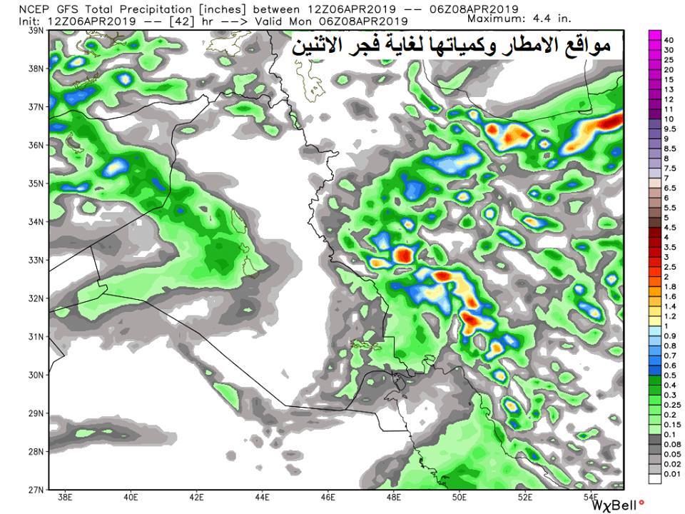-اما ليل الاحد فمن المتوقع هطول زخات من الأمطار الخفيفة في الموصل وشمال وشرق الانبار وبعض مناطق بادية السماوة جهة الحدود وربما تمتد الامطار الخفيفة نحو مناطق متفرقة من البصرة وميسان وشمال اربيل وصلاح الدين في وقت متأخر ليل الاحد .