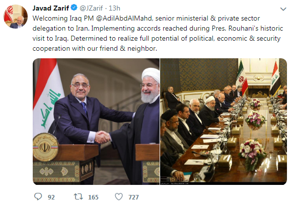 وقال ظريف في تغريدة له على توتيتر: "استضفنا رئيس الوزراء العراقي عادل عبدالمهدي والوفد الوزاري رفيع المستوى المرافق له والقطاع الخاص العراقي خلال زيارتهم لايران".