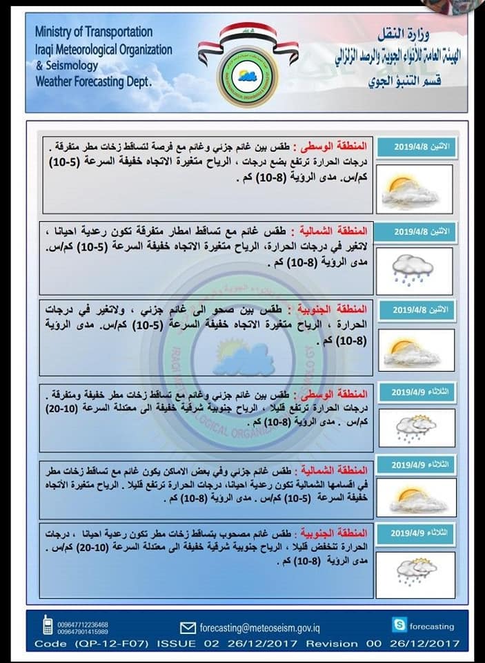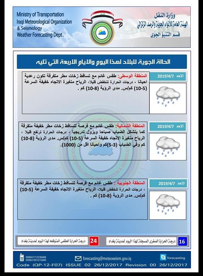 وذكرت الهيئة في تقريرها الذي نشر اليوم، (7 نيسان 2019)، ان "طقس البلاد غائم جزئي وغائم مع تساقط امطار متفرقة في البلاد لليومين المقبلين".