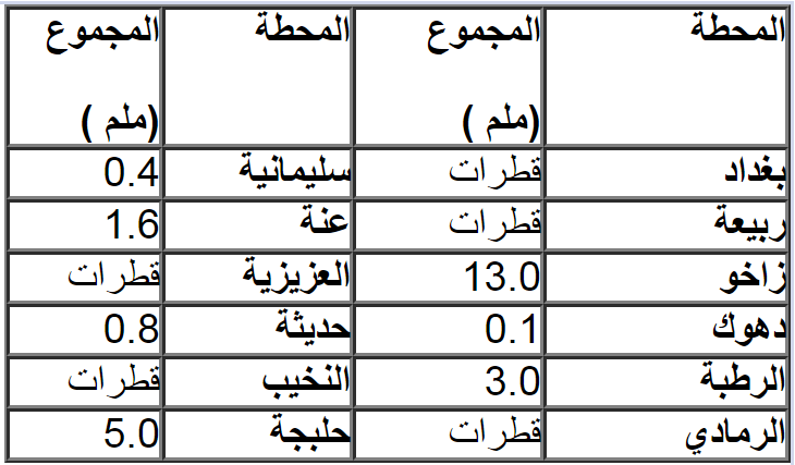 وكانت هيئة الانواء الجوية، قد نشرت أيضا جدولا بالترسبات المائية الساقطة لمحطات العراق خلال الــ 24 ساعة الماضية بالملم، حيث يظهر أن أعلى معدلات الأمطار كان في زاخو وبكمية 13,0 ملم، تلتها حلبجة وبواقع 5,0 ملم، تلتها مدينة الرطبة وبواقع 3,0 ملم ومن ثم مدينة عنة وبواقع 1,6 ملم"
