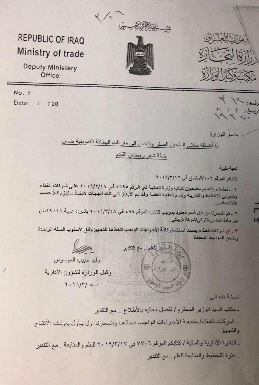 وبحسب كتاب رسمي طالبت الوزارة باضافة مادتي "الطحين الصفر والعدس" الى مفردات البطاقة التموينية في شهر رمضان المقبل.