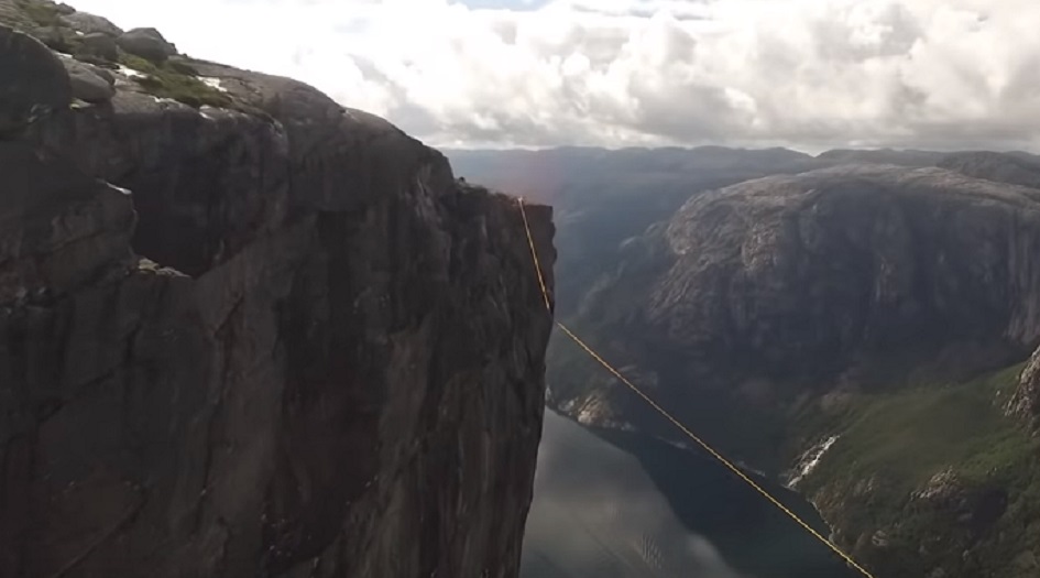واستراح المغامر النرويجي لفترة قصيرة بجلوسه على الحبل، قبل إكماله السير عليه وقطع المسافة بين الجرفين الصخريين.