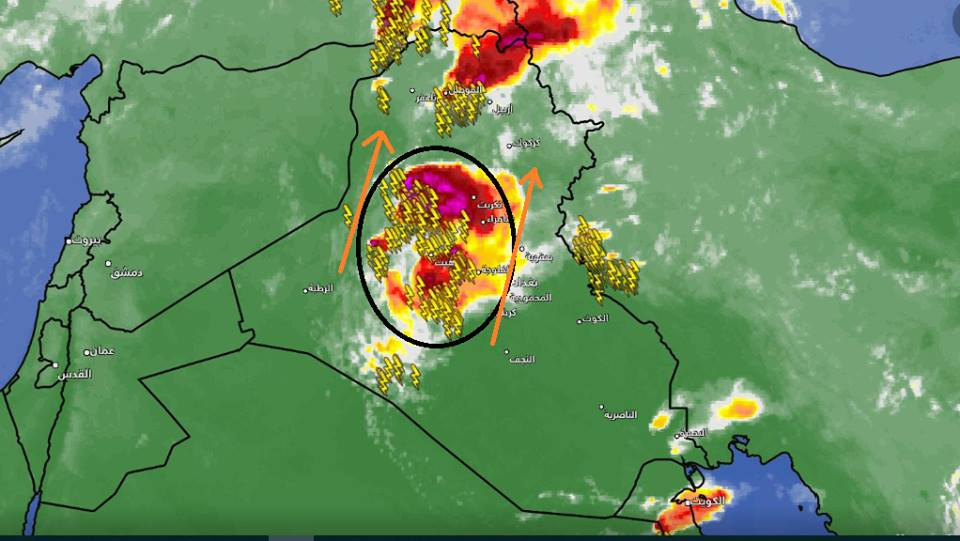 وأضاف عطية أن المناطق الواقعة داخل الدائرة تتعرض الى أمطار غزيرة وسحب عملاقة تتجه نحو المناطق الشمالية من البلاد حسب الاسهم.