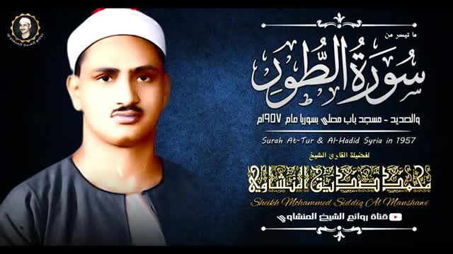 تلاوات معطرة - الكوثر: تلاوة عطرة للقارئ الكبير الشيخ محمد صديق المنشاوي مما تيسر له من سورة الطور (17-49) وسورة الحديد (1-6) تلاها عام 1957 في مسجد باب مصلى بسوريا.