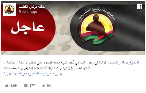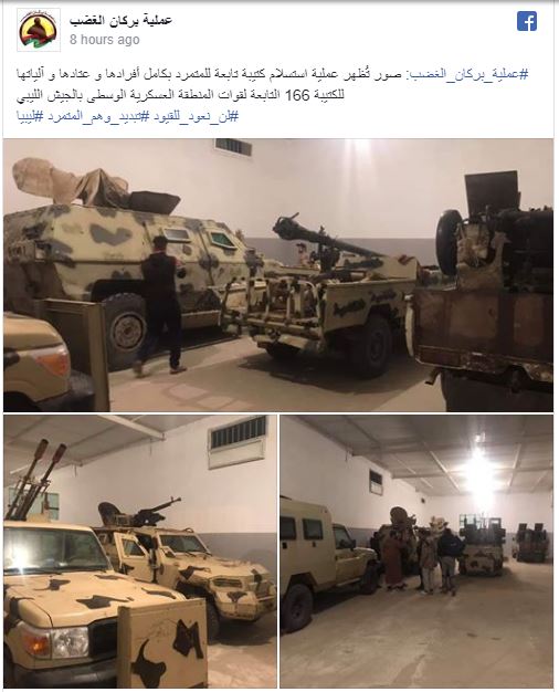 وقالت عملية "بركان الغضب"، التي أطلقتها الحكومة المعترف بها دوليا عبر صفحتها بموقع "فيسبوك"، إن الكتيبة 166 التابعة لقوات المنطقة العسكرية الوسطى في الجيش الليبي، وتضم 25 فردا و10 آليات عسكرية.