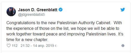 وكتب جيسون غرينبلات مبعوث الرئيس الأمريكي دونالد ترامب لعملية السلام بالشرق الأوسط، عبر تويتر: "تهانينا لحكومة السلطة الفلسطينية الجديدة... من خلال خبرة أعضائها، نأمل في أن نتمكن من العمل معا لإحلال السلام وتحسين حياة الفلسطينيين. لقد حان الوقت لفتح فصل جديد".