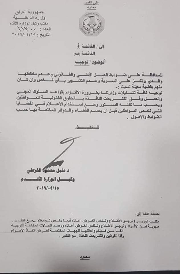 كما وجه الوكيل الاقدم "كل تشكيلات الوزارة بضرورة الالتزام بقواعد السلوك المهني والعمل وفق التشريعات النافذة بالحقوق القانونية للمواطنين بحسب ما كفله الدستور والتشريعات النافذة ومنع استخدام الاعلام في مثل هكذا قضايا قبل ان يحسم القضاء والدوائر الختصة بالموضوع، ووجه مديرية امن الافراد بمتابعة التنفيذ لذلك"، بحسب ما جاء في البيان.