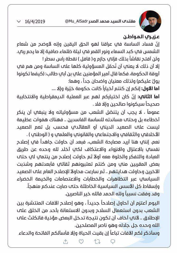 وقال الصدر في تغريدة له عبر حسابه الرسمي على "تويتر"، "عزيري المواطن .. إن فساد الساسة في عراقنا لهو الحق اليقين وإنه لأوضح من شعاع الشمس في كبد السماء ونور القمر في ليلة ظلماء صافية إلا ما رحم ربي، ولن أفتح نقاشا بذلك فإني جازم و (قافل) نقطة راس سطر! إلا أن ذلك لا يعني أن نحمل المسؤولية كلها على الساسة ومن هم في أروقة الحكومة، فكما قال أمير المؤمنين علي بن أبي طالب: (كيفما تكونوا يول عليكم) ولذلك معنيان واضحان جدا، وهما: أما الأول: إنكم إن كنتم أخيارة كانت حكومة خيرة وإلا ....، أما الثاني: إن كان اختياركم لهم عبر العملية الديمقراطية والانتخابية صحيحا سيكونوا صالحين وإلا فلا".