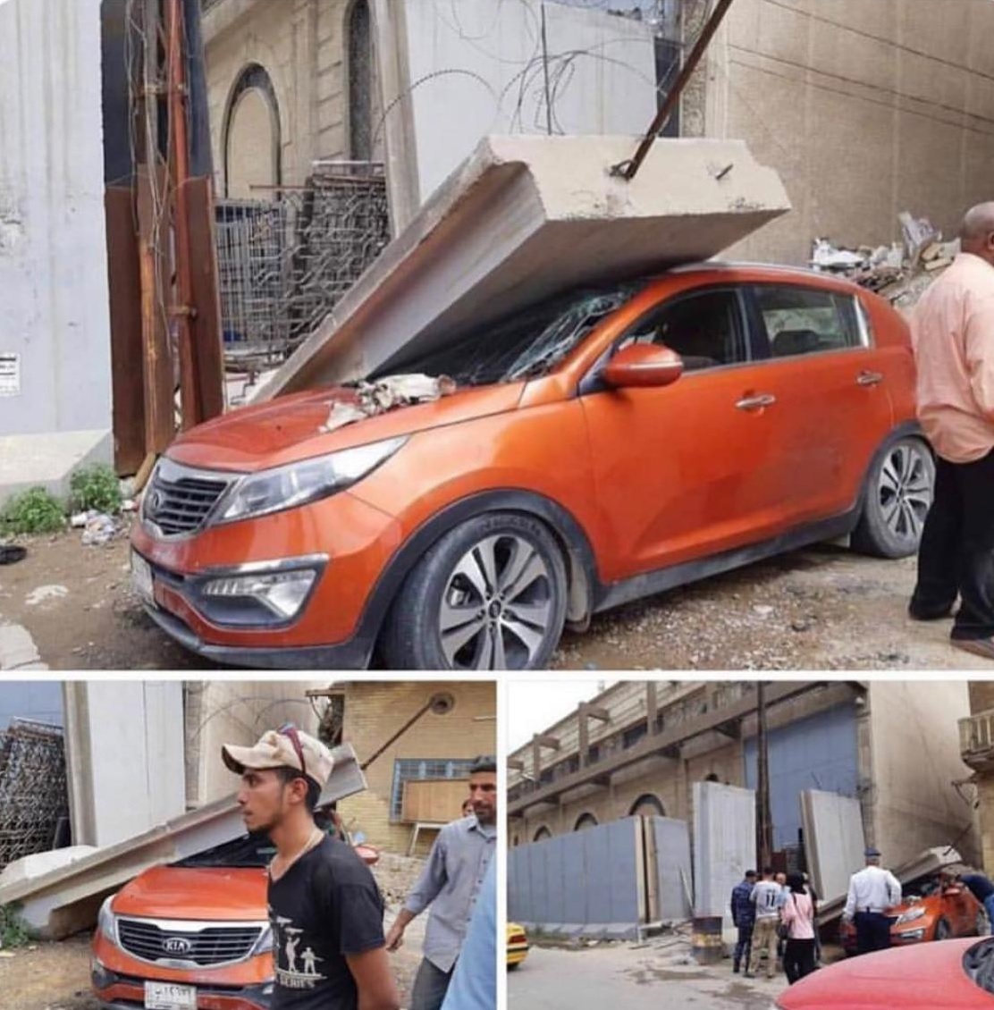 وكشف مصدر ان" الكتلة الكونكريتية سقطت بشكل مفاجئ على العجلة نوع {كيا سبورتج} التي كانت واقفة امامها بالقرب من مصرف الرافدين فرع باب المعظم ما ادى الى تحطميها". وأشار الى" عدم تسجيل أي إصابة بشرية نتيجة الحادث"