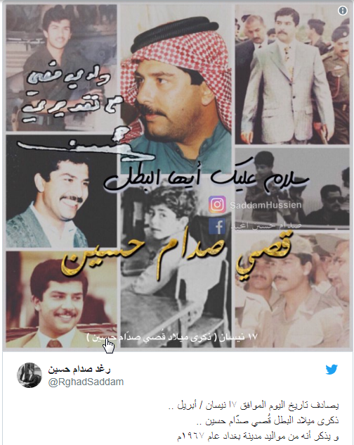 وكتب رغد في تغريدة: "اليوم 17 أبريل يصادف ميلاد البطل قصي صدام.. فقد ولد في بغداد عام 1967".