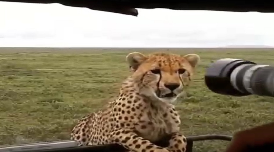 كان المصور يلتقط صورا لبعض الحيوانات البرية، قبل أن يقترب منه الفهد ويحاول أن يصعد إلى السيارة، التي يستقلها، لكن المصور استطاع أن يقف في وجهه، ويمنعه.