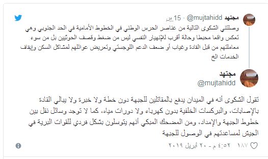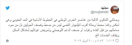 وقال “مجتهد” في سلسلة تغريدات له على حسابه بتويتر حيث يتابعه أكثر من 2 مليون شخص، إن هذه الحالة لدى جنود المملكة لم تنتج من ضغط وقصف انصار الله بل من سوء معاملتهم من قبل القادة وغياب أو ضعف الدعم اللوجستي وتعريض عوائلهم لمشاكل السكن وإيقاف الخدمات.