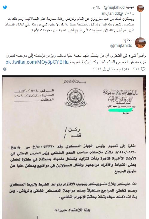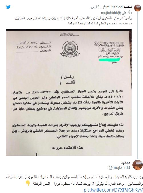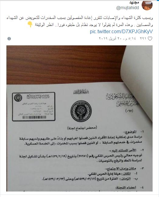 واختتم مجتهد تغريداته بالإشارة إلى أنه بسبب كثرة القتلى والإصابات تتقرر إعادة المفصولين من الجيش بسبب المخدرات للتعويض عن القتاى والمصابين.