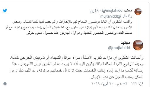 وأوضح المغرد الشهير أيضا أن ما ينشر في الإعلام عن تكريم أسر القتلى ودفع تعويضات لهم، مجرد شو إعلامي وأمر لا يتم في الحقيقة، هذا إضافة لكذب مزاعم إلغاء إيقاف الخدمات حيث لا تزال خدماتهم موقوفة وعوائلهم تطرد من السكن بسبب العجز عن دفع الإيجار.