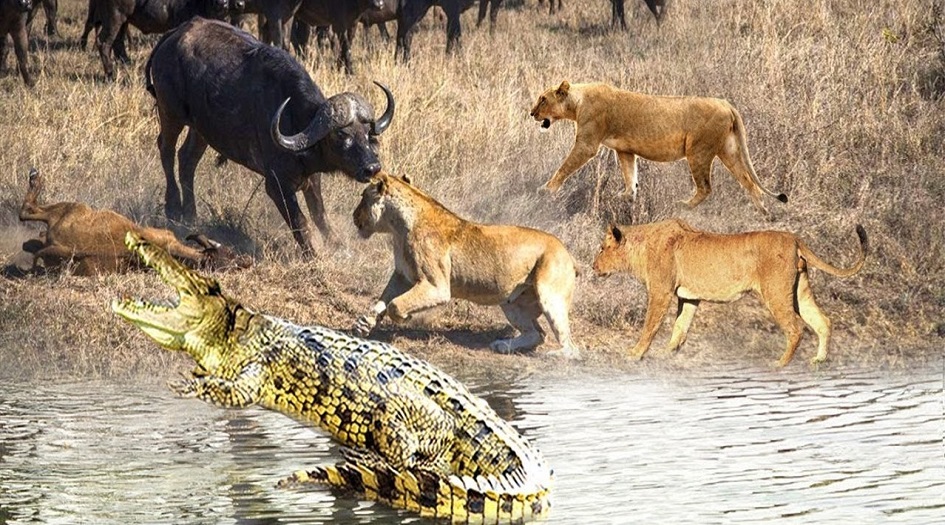 استطاع جاموس بري، أن ينجو من التمساح، الذي حاول التهام جزء منها داخل المياه، لكنها وجدت مصيرا مجهولا ينتظرها على الشاطئ.