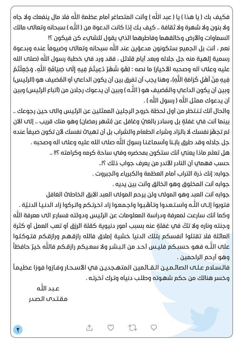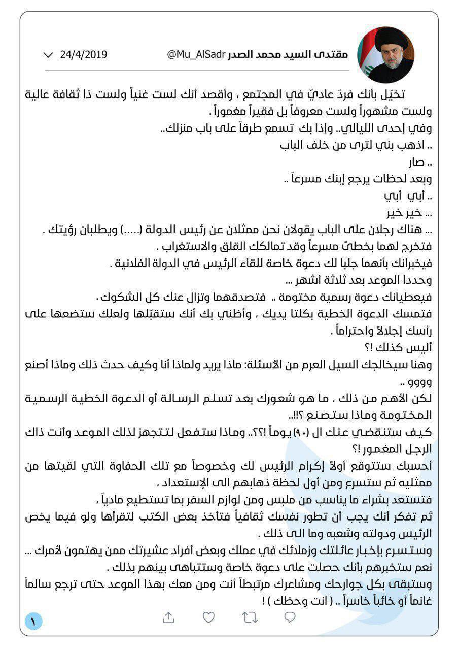 وقال الصدر في تغريدة على موقع التواصل الاجتماعي "تويتر" اليوم (24 نيسان 2019)، "توبوا إلى الله واستعدوا وتأهبوا واجمعوا زاد آخرتكم واتركوا زاد الدنيا الدنية".