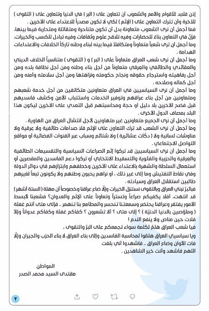 وقال الصدر، في تغريدة على "تويتر" اليوم، 25 نيسان 2019، إن "على السياسيين ترك إثم الصراعات السياسية والتقسيمات الطائفية والتسقيط الانتخابي وترك دعم الفاسدين، واستعمال السلطة للاعتداء على الآخرين وابتزازهم وخطفهم في دوائر الدولة ونقاط التفتيش".
