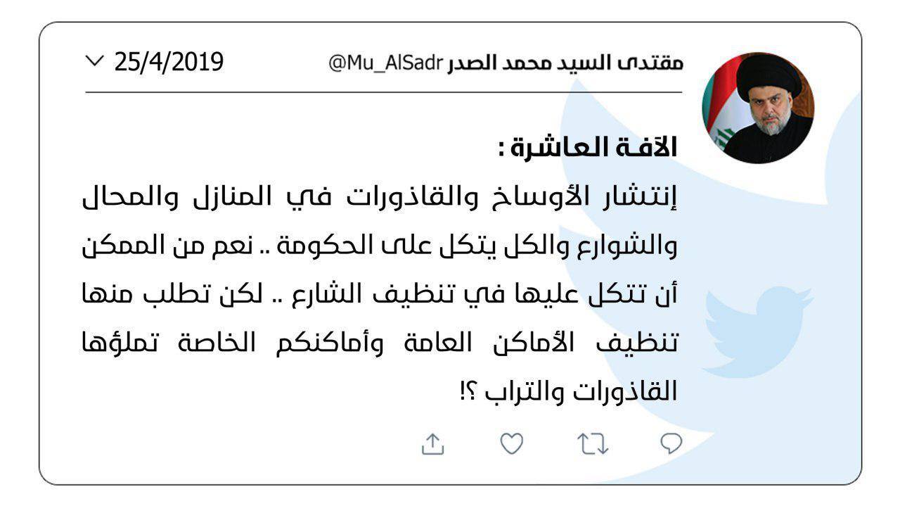 وقال الصدر في تغريدة له على حسابه الرسمي بموقع "تويتر" مساء امس الخميس، 25 نيسان 2019، "إنتشار الأوساخ والقاذورات في المنازل والمحال والشوارع، والكل يتكل على الحكومة.. نعم من الممكن ان تتكل عليها في تنظيف الشارع".