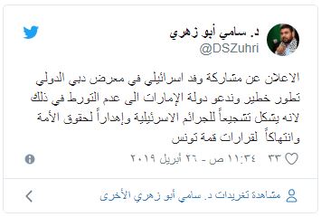 ودعا القيادي في حماس سامي أبو زهري في تغريدة عبر (تويتر) دولة الإمارات إلى عدم التورط في ذلك لأنه يشكل تشجيعاً للجرائم الإسرائيلية وإهداراً لحقوق الأمة وانتهاكاً لقرارات قمة تونس.