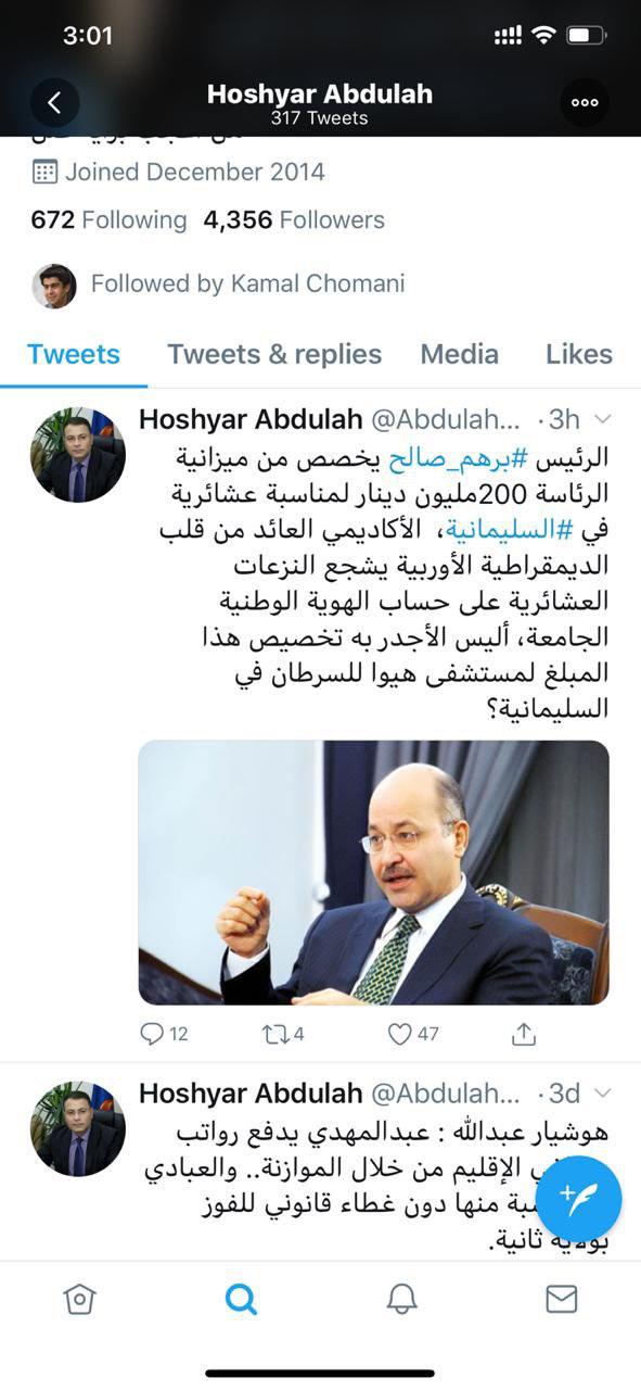 العراق - الكوثر: نفى مصدر مطلع صحة المعلومات التي غرد بها النائب هوشيار عبدالله متهما رئيس الجمهورية بهدر المال العام، وطالبه باثبات صحة ادعاءاته واتخاذ الطرق القانونية اذا كان صادقا خصوصا وأنه نائب في البرلمان، وتساءل المصدر اذا كان كلامك صحيحا لماذا لا تذهب الى القضاء.
