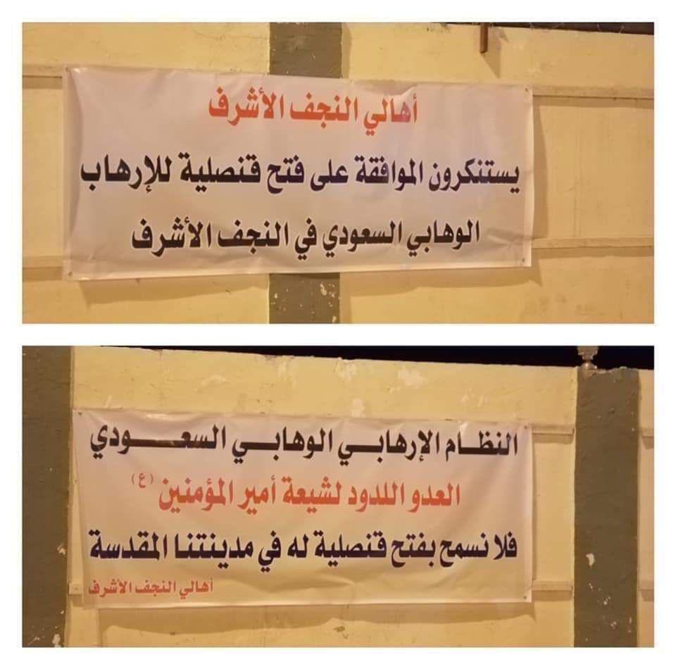 نفذ اهالي مدينة النجف الاشرف جنوب العاصمة العراقية عدة الفعاليات الشعبية والشبابية اعلنت عن رفضها واستنكارها الموافقة على افتتاح قنصلية سعودية في المدينة المقدسة.