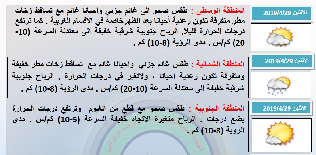 وقالت الهيئة في بيان إن "الطقس سيكون في المنطقتين الوسطى والشمالية ليوم غد الاثنين صحو الى غائم جزئي واحيانا غائم مع تساقط زخات مطر متفرقة تكون رعدية أحيانا بعد الظهر خاصة في الاقسام الغربية مع ارتفاع لدرجات الحرارة قليلا، فيما سيكون الطقس في المنطقة الجنوبية صحو مع قطع من الغيوم وترتفع درجات الحرارة".