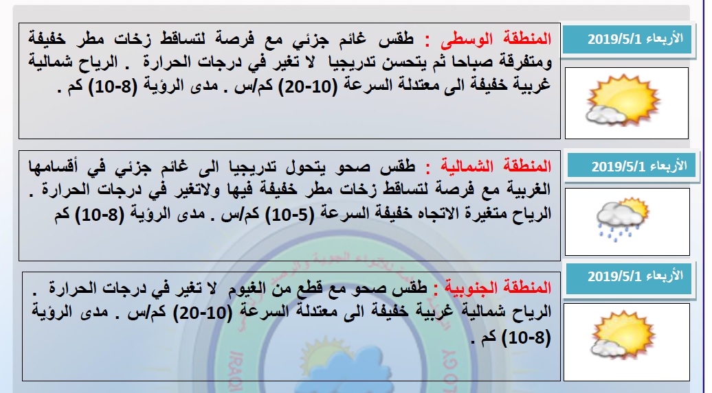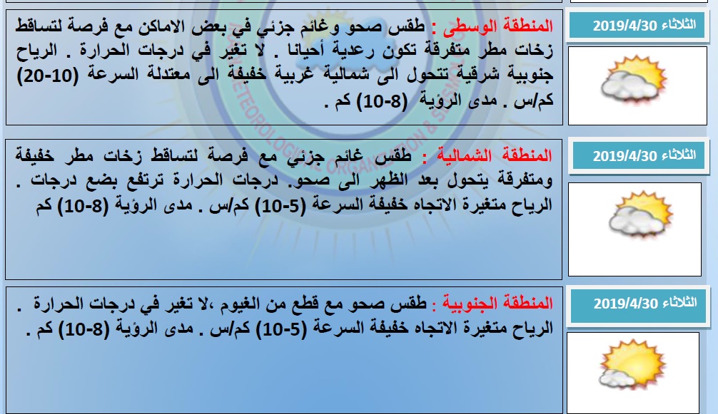واضافت الهيئة ان "الطقس سيكون في المنطقة الوسطى ليوم الثلاثاء صحو وغائم جزئي في بعض الاماكن مع فرصة لتساقط زخات مطر متفرقة تكون رعدية أحيانا، فيما سيكون الطقس في المنطقة الشمالية غائم جزئي مع فرصة لتساقط زخات مطر خفيفة ومتفرقة يتحول بعد الظهر الى صحو"، مبينة ان "الطقس سيكون في المنطقة الجنوبية صحو مع قطع من الغيوم ،ال تغير في درجات الحرارة".