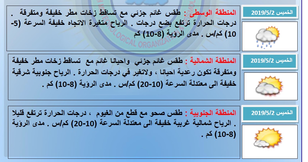 وبينت الهيئة ان "الطقس سيكون في المنطقتين الوسطى والشمالية ليوم الخميس غائم جزئي مع تساقط زخات مطر خفيفة ومتفرقة، فيما سيكون الطقس في المنطقة الجنوبية صحو مع قطع من الغيوم ".