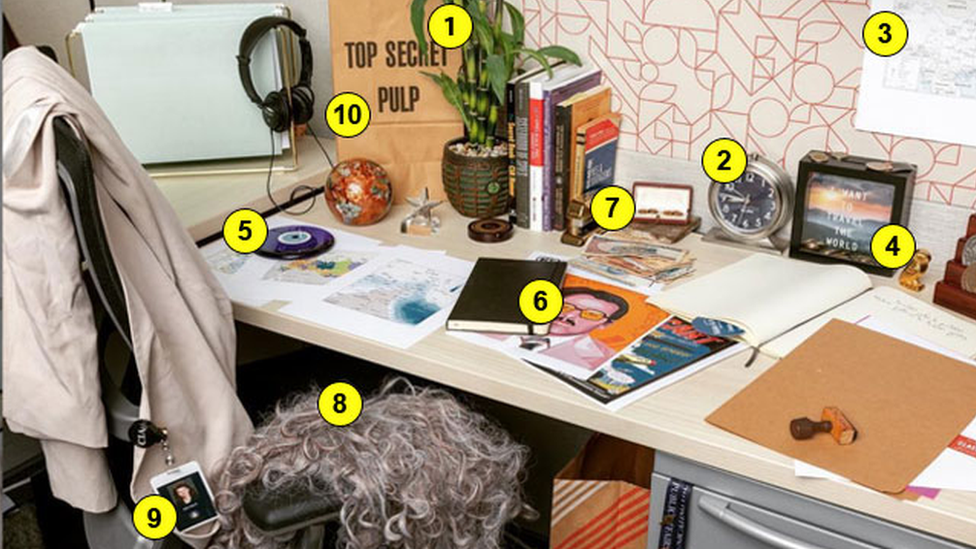 وتظهر الصورة الأولى لحساب الوكالة، مكتبا وكرسيا وعددا من الكتب والخرائط، فضلا عن شعر مستعار، وبطاقة عميل وسماعة وبعض الأوراق والملاحظات.