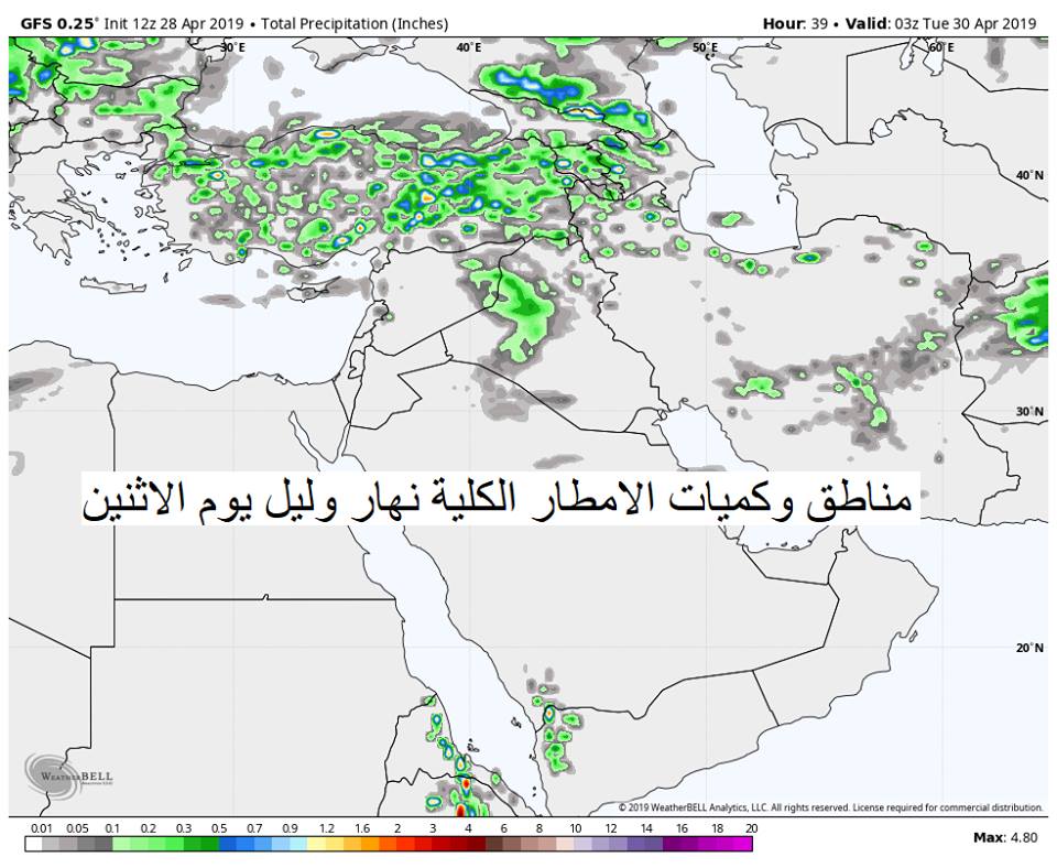 وأوضح انه "في وقت متأخر من الليل من المتوقع ان تشمل الامطار كركوك والسليمانية وربما تشمل اطراف من غرب كربلاء والنجف وبادية السماوة بقطرات من الامطار ليل الاثنين"، مبينا ان "الهطول سيصحبه البرق والرعد احيانا والامطار مابين قطرات في بعض الاماكن (مثل العاصمة وكركوك) او الخفيفة (شمال الموصل ودهوك) والمتوسطة ( الانبار والموصل) مع بعض الغزارة تشمل شمال الانبار وصلاح الدين".