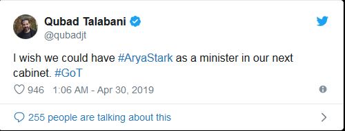 وكتب في تغريدة على موقع التواصل الاجتماعي "أتمنى لو أننا نستطيع الحصول على آريا ستارك كوزيرة في الحكومة المقبلة".