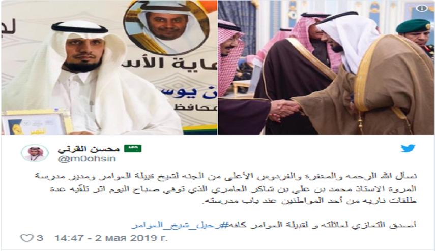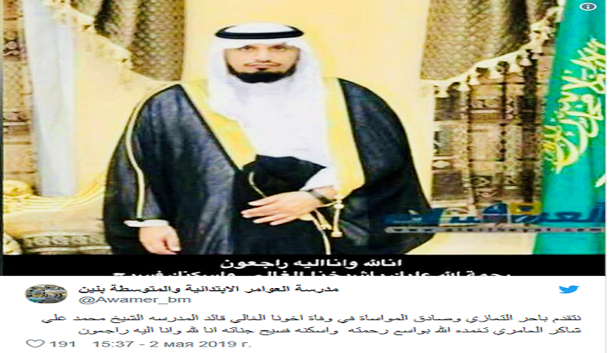 وأضاف قائلا: "كانت آخر أعماله المتناقلة تكريمه لأبناء شهداء الواجب من طلابه وأبناء القبيلة قبل يومين في لجنة التنمية الاجتماعية، كان في منتصف عقده الخامس ولديه مكاتبات وأوراق من الملك فيصل رحمه الله".