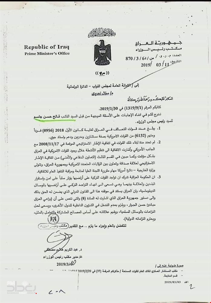 وحصلت "بغداد اليوم"، على وثيقة صادرة من مكتب رئيس الوزراء العراقي، وموجهة الى الأمانة العامة لمجلس النواب- الدائرة البرلمانية، بعنوان "سؤال تحريري"، جاء فيها، ان "عدد قوات التحالف في العراق لغاية كانون الأول 2018، يبلغ 8956 فردا، ومنهم 6132 من القوات الأميركية بصفة مستشارين ومدربين ودعم وأسناد جوي".