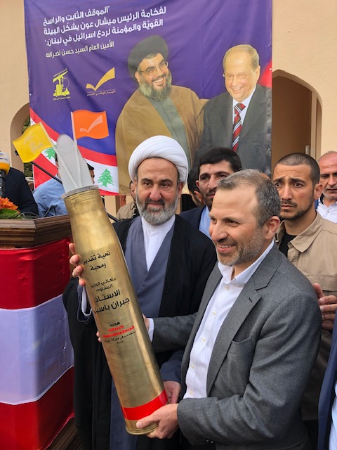 تلقّى وزير الخارجية اللبناني، جبران باسيل، قذيفة كهدية رمزية من حزب الله اللبناني.