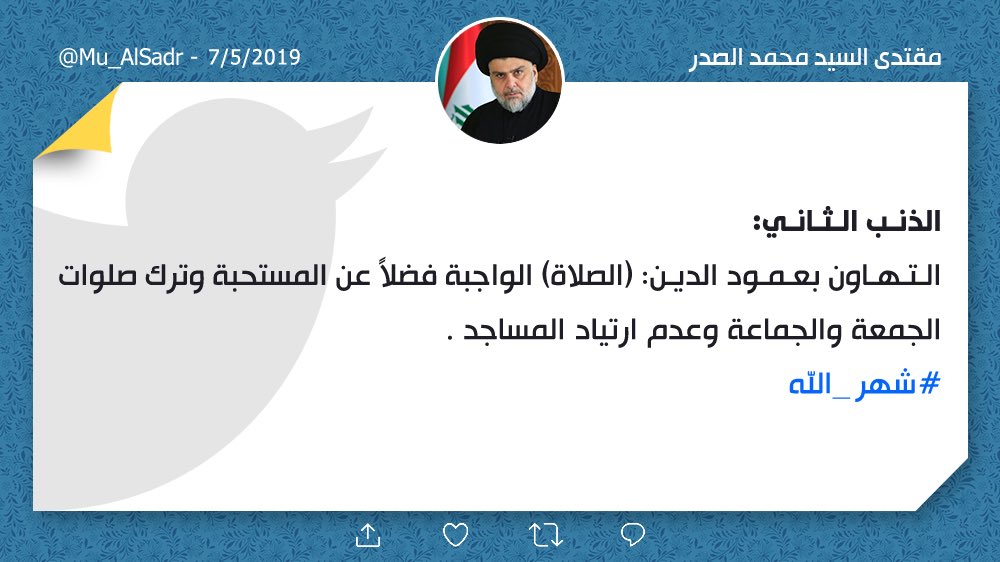 قال زعيم التيار الصدري مقتدى الصدر، في تغريدة على تويتر، امس الثلاثاء، (7 ايار 2019)، ان الذنب الثاني هو التهاون بعمود الدين: الصلاة الواجبة فضلا عن المستحبة وترك صلوات الجمعة والجماعة وعدم ارتياد المساجد.