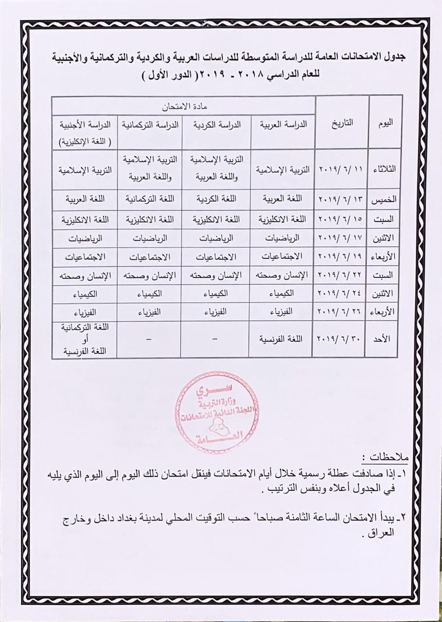 وقال مدير العلاقات العامة والاعلام في الوزارة فراس محمد حسن في بيان تلقت، السومرية نيوز، نسخة منه، ان "الامتحانات ستبدأ يوم الثلاثاء الموافق 2019/6/11 وتنتهي يوم الاحد الموافق 2019/6/30 ".