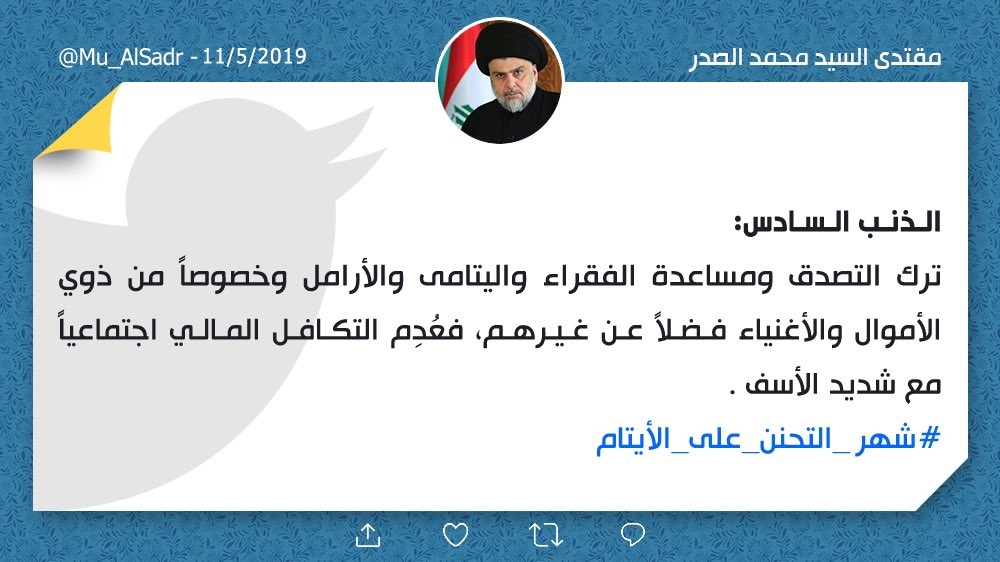 قال زعيم التيار الصدري مقتدى الصدر، في تغريدة على تويتر، اليوم السبت، (11 ايار 2019)، ان الذنب السادس هو: ترك التصدق ومساعدة الفقراء واليتامى والارامل وخصوصا من ذوي الاموال والاغنياء فضلا عن غيرهم، فعدم التكافل المالي اجتماعيا مع شديد الاسف.