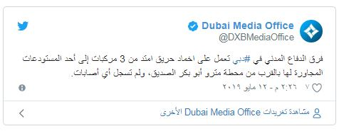وبحسب الصفحة الرسمية لحكومة دبي، فإن الحادث، الذي وقع بالقرب من محطة مترو "أبو بكر الصديق" في المدينة، لم يسفر عن أية أصابات.