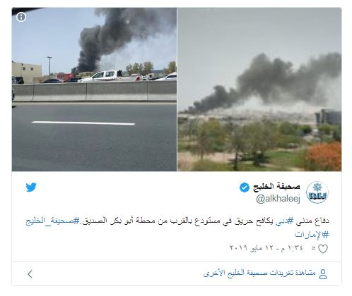 تعمل فرق الدفاع المدني، في مدينة دبي بالإمارات، على إخماد حريق شب، اليوم الأحد، في عدة مركبات وامتد إلى مستودع قريب.